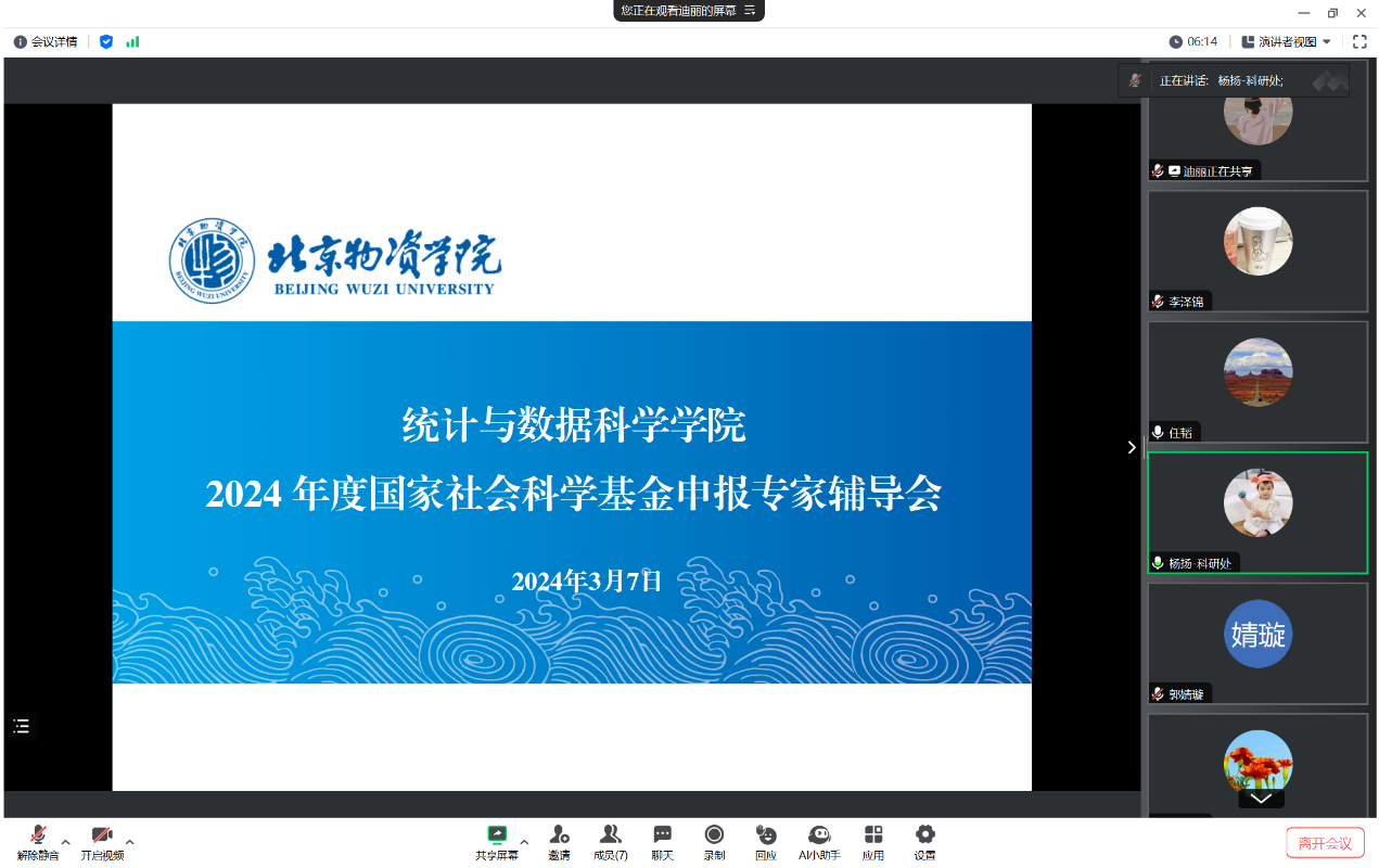 2024年3月7日,科研处联合伟德体育于线上举办了2024年度国家社会科学基金申报专家辅导会。本次辅导会邀请了首都经济贸易大学统计公司任韬教授作为辅导专家,与申请者进行一对一的交流和指导。公司申报2024年度国家社会科学基金的青年教师参加了此次辅导会,会议由科研处处长助理杨扬老师主持。
