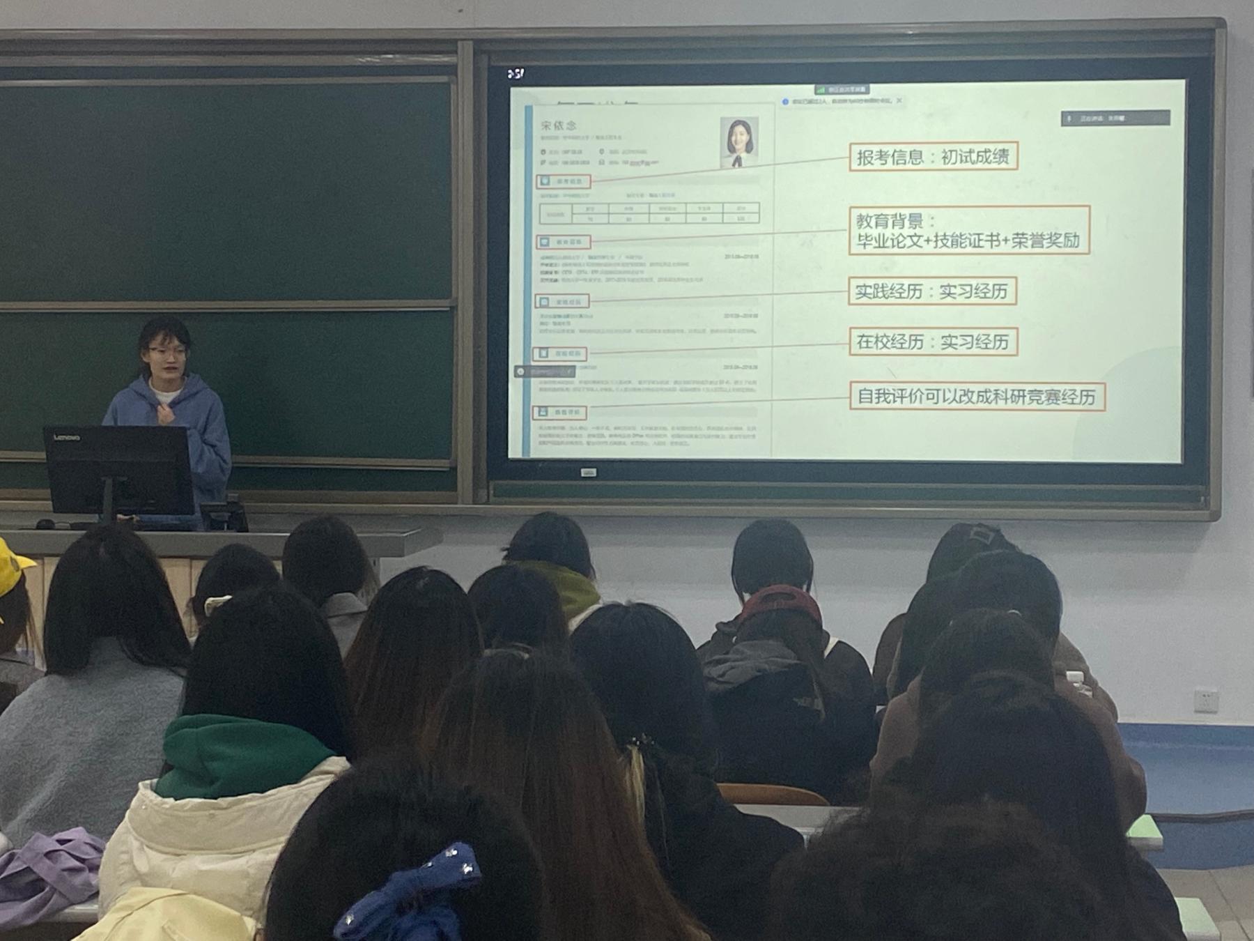 随后,燕雪倩同学着重于简历和专业课面试方面进行了经验分享。燕雪倩同学指出,简历是老师认识我们的第一步,一份优秀的简历应该包含报考信息、教育背景、实习经历、在校经历以及自我评价等多个方面。我们需要在有限的时间内,尽可能全面地展现自己的风采和实力。在专业课面试方面,燕雪倩同学建议大家要全面复习考纲内的所有知识,做到胸有成竹。最后,燕雪倩同学还分享了一些实用的面试技巧和注意事项,让毕业年级的党员们受益匪浅。