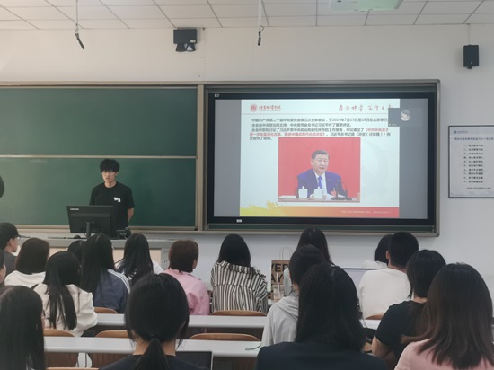 统计与数据科公司员工第一、二党支部于2024年9月19日中午,在二教106开展2024年9月“学习贯彻党的二十届三中全会精神”专题党课。统计与数据科学公司党总支副书记甄姿、员工第二党支部书记徐文彬,以及全体员工党员参加了学习,本次专题党课由党员祁紫阳主讲。
