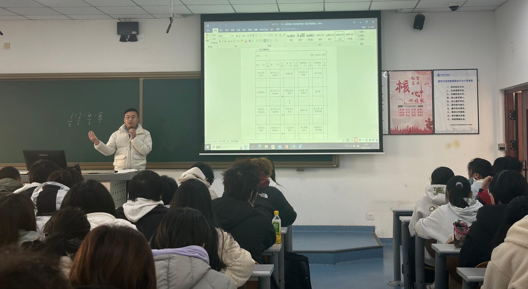 同时,徐老师紧密结合综合测评表,将其细化为“德”“智”“体美”“创新精神”“其他情况”五个维度进行深度解读。在“德”方面,着重考查学员在公益活动、志愿服务以及集体活动中的参与积极性与贡献度;“智”的维度聚焦于学业成就,激励学员在专业学习上勇攀高峰;“体美”涵盖了体测达标情况、运动会参与及文艺活动获奖等内容,倡导学员实现全面发展;“创新精神”鼓励学员积极参与科研探索,勇于创新突破;“其他情况”则将员工干部经历、辅修成果以及各类荣誉表彰纳入考量范围。徐老师还通过列举丰富的实际案例,生动形象地剖析了各个指标的内涵与得分要点,为学员们提供了极具操作性的行动指南。