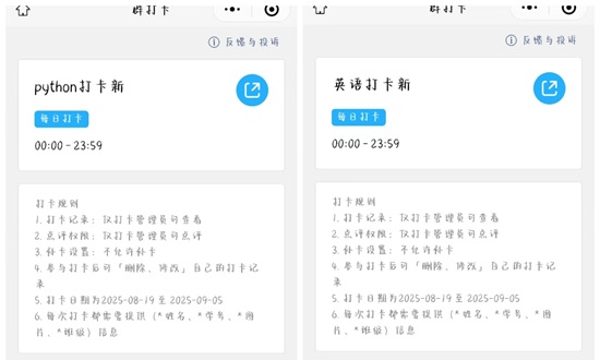 立足专业特色,公司推出的 “Python学习”以“每日精进”模式有序推进。每日发布学习任务后,在班级群及时温馨提醒完成进度,鼓励新生分享代码成果共研共进。部分班级自发组建“代码交流沙龙”,云端切磋编程心得,让严谨的代码世界涌动着互助成长的暖流,活跃的学习氛围在指尖与屏幕间悄然升温。